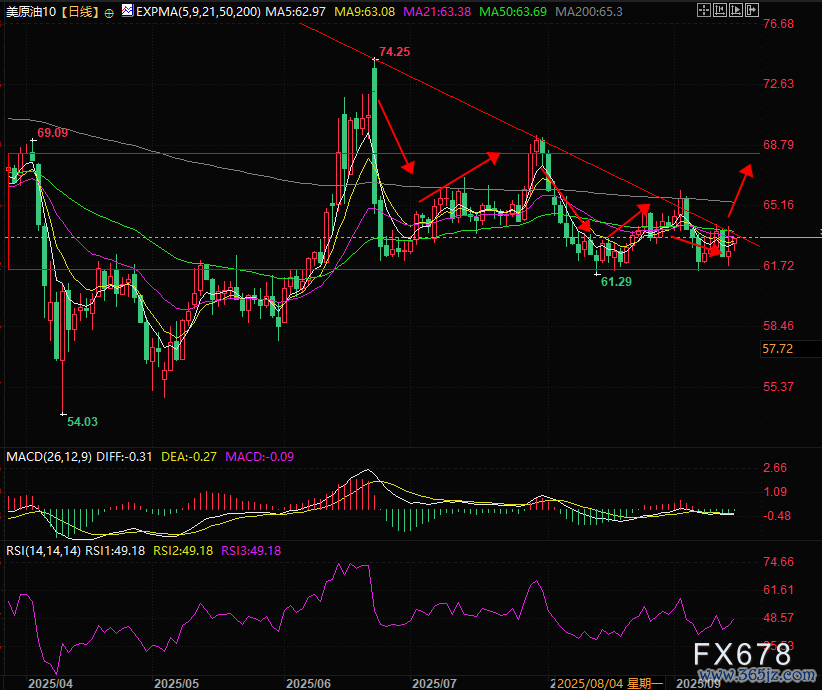 自2025年6月(由以伊冲突触发的)油价高点以来,好意思原油10月期货合约价钱历久处于三角形整理形态内运转。价钱走势呈现“高点下移、低点上移”的典型整理特征,且历久未跌破61好意思元瑕疵复古位。