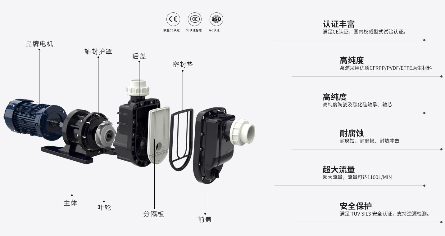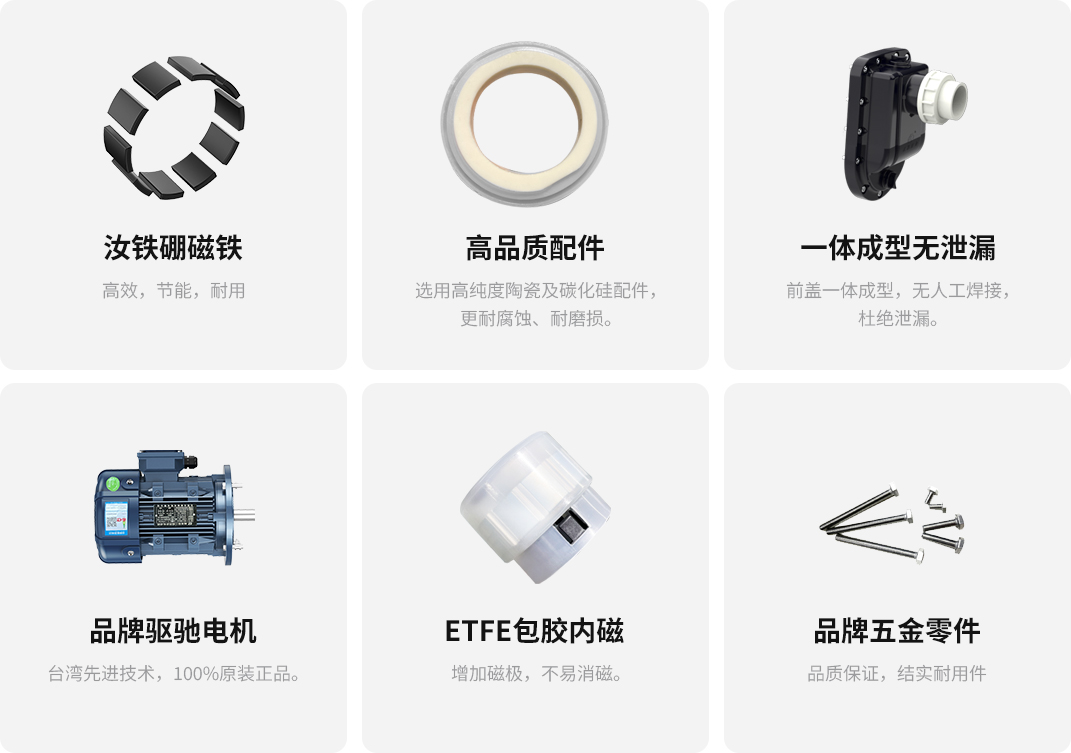 主體與葉輪獨(du)立設計,拆裝便(bian)捷; 泵浦采用優質原生PP/PVDF, 提升(sheng)耐腐蝕(shi)能力及結構強度(du); 內置自(zi)冷式(shi)防空(kong)轉系統,