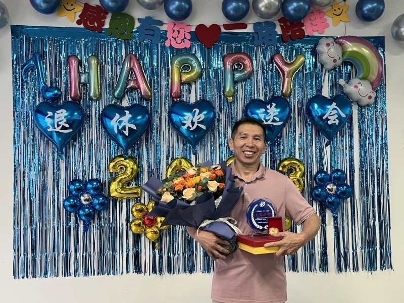 退休(xiu)儀式上(shang),劉(liu)總助(zhu)為曾師(shi)傅獻上(shang)“忠誠員(yuan)工金(jin)牌”、“退休(xiu)紀念獎杯”以及鮮花。在全體員(yuan)工的祝(zhu)福下,曾師(shi)傅正(zheng)式光(guang)榮退休(xiu)。